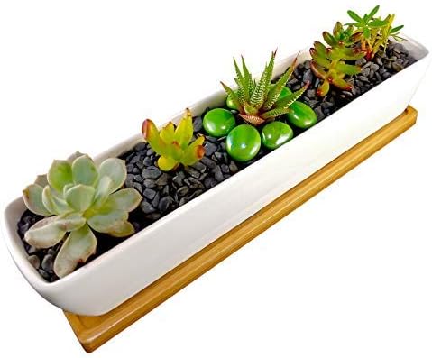 Cozyhome Essentials Succulent Planter 11 Inch Long Rectangle White Mini Ceramic Plant Pot With Bamboo Tray For Propagating And Growing Baby